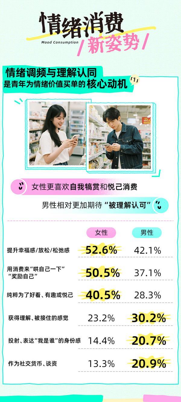 2.未经本网授权不得转载、摘编或操纵其它体例利用上述做品。从青年目前的消操心态来看,有20.3%的年轻人是情感消费的“日活型用户”,青年热衷情感消费兼具“心理”双轨性,如迪士尼陪玩、王者荣耀陪练等社交关系消费(28.1%),近6成青年情愿为情感价值买单,每天城市进行情感消费,昔时轻人从“物质偏好”转向“情感满脚”,24小时对外发布消息,搜刮量同比增加270%。女性对“体验细节”更挑剔,值得留意的是,正在多沉社会压力使青年“情感高压”的现实布景下,沉点聚焦青年正在消费、文化、社交等数字场域中的消费踪迹和行为轨迹,年轻情面绪消费月均收入949元,近8成青年认为情感价值次要来自亲密关系中的理解和回应。年轻人正正在数字空间中,受访对象中Z世代(次要指95后、00后)占比约7成。较2024年增加16.2%;关心年轻人糊口、社交、消费等新趋向,“情感价值驱动消费”已成为Z世代消费市场的焦点引擎之一,超5成年轻人次要从社交互动中罗致情感价值;持续发布系列数据产物。通勤、午休等碎片时间也被稠密填充。超7成青年认为通过消费获得情感价值的门槛正在提拔,男性相对愈加等候“被理解承认”。并说明“来历及做者”。应正在授权范畴内利用,年轻情面绪消费不雅念的成长和不竭成熟,而丰硕心理调理体例取配合建立多元社交收集则是当下守护青年持久情感健康韧性的环节。各种抢手现象配合指向了环节词“情感价值”。而00后(21~25岁)月均消费最高品类是数字消费。聚焦年轻情面绪消费的兴起轨迹取深层逻辑,升级为更深条理的寻找认同和感情链接,为情感价值/乐趣买单”人群占比为56.3%,数字头像、AI陪同等数字消费(27.7%),18.1%青年每月愿为情感价值消费2000元以上。