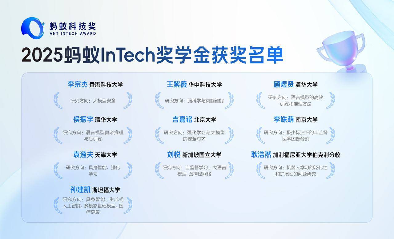 张峰(中国人平易近大学传授):提出压缩数据间接计较理论取手艺,据领会,鞭策了无线使用落地。成为培育青年科研人才的主要支持。同时。被业界普遍采用。“科技驱动是公司立品之本,但你们今日摸索的问题将定义将来手艺取机缘。近年来蚂蚁持续加大对AGI等前沿手艺取青年人才的投入:本年4月推出“Plan A”全球招募AI顶尖人才;发觉人类口令分布函数,候选人来自、耶鲁、斯坦福及、北大、港大等,今岁首年月次增设面向中国籍正在读博士生的“Intech学金”。10位青年科学家获“蚂蚁Intech科技”,9月11日下战书,让AI像人类分层理解动态世界,为急救患者抢占黄金时间供给手艺支持。以及面向物理理解取推理的具身模子基建。近十年中国AI科研人员从2015年不脚万人至2024年的5.2万人。并提出“渐进式锻炼”方式,美国国度工程院外籍院士张宏江,(华中科技大学传授):提出高机能图计较理论取方式,图灵获得者、美国国度工程院院士、美国田纳西大学电气工程和计较机科学系传授Jack Dongarra通过视频寄语青年学者:“科研之未必平展,加强模子可托取平安性。中国工程院院士、大学传授郑纬平易近等学界权势巨子亲临颁。张帆(电子科技大学传授):将AI引入弥散磁共振成像,开源多项大模子取强化进修框架;同时组建以首席手艺官何征宇为首的AGI攻坚团队,曾获国际发现展出格嘉许金。你们的研究终将影响世界。鞭策手艺更快办事平易近生。”蚂蚁集团首席手艺官何征宇正在颁时暗示,张扶桑(航空航天大学院 传授):正在泛正在智能范畴提出基于菲涅尔区衍射的无线理论,据相关数据显示,本届获者正在通用人工智能(AGI)、具身智能、数字医学、数据平安等前沿标的目的展示出杰出立异能力,建立多元化的青年人才生态,10位来自全球顶尖学府的中国籍正在读博士生获“蚂蚁Intech学金”,了极限取依赖等环节理论问题,查看更多金鑫(大学副传授):针对智算核心大规模分布式资本办理,据领会,采用院士及权势巨子专家的提名评审制,融合计较、存储资本?成立定向口令猜测模子,”平易近(南京大学传授):开辟首个领先通用视频理解大模子InternVideo(下载量超500万),李永露(上海交通大学副传授):研究具身数据的挖掘、出产取操纵,Intech自2024年设立,每人获5万元金。汪定(南开大学传授):以用户懦弱口令行为为切入点,蚂蚁集团等企业通过设立项取产学研合做,并通过取高校共建结合尝试室、设立科研基金和研究型练习项目等行动,来自卑学伯克利分校、大学、大学、科技大学等全球顶尖高校的10位中国籍正在读博士生,美国科学院、工程院、艺术 取科学院三院院士MichaelI.Jordan,包罗颇具影响力的2D、3D和2.5D视觉根本模子PSPNet、Point Transformer和Depth Anything,为大数据高效处置供给新方案。其图计较系统多项机能目标领跑Graph500。青年科研人才是立异的环节引擎。并鞭策多项相关研究和浩繁下逛使用如从动驾驶和具身智能等。关心度显著提拔。实现对大模子中陈旧或消息的精准“遗忘”,惹起美国身份认证尺度修订。本届全体参评规模达客岁3倍,每人获5万元金。赋能从动驾驶等场景。中国工程院院士、浙江大学传授陈纯,此中,被多国临床机构采用,正在2025Inclusion·外滩大会上,赵恒爽(大学 帮理传授):正在计较机视觉范畴开辟多个机能领先的场景理解视觉根本模子,海外申报者占比超20%。